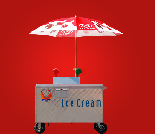 Es stehen zwei verschiedene Größen an Eis-Ständen zur Verfügung. Zusätzlich wird auf der Bedienerseite der Stände eine Eistruhe platziert. Beide Stände sind mit verschiedenen Schirmen (Farbe: gelb, terra oder rot / weiß) oder einem Ruck Zuck Zelt buchbar