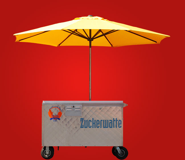 Es stehen zwei verschiedene Größen an Zuckerwatte-Ständen zur Verfügung. Beide Stände sind mit verschiedenen Schirmen (Farbe: gelb, terra oder rot / weiß) oder einem Ruck Zuck Zelt buchbar